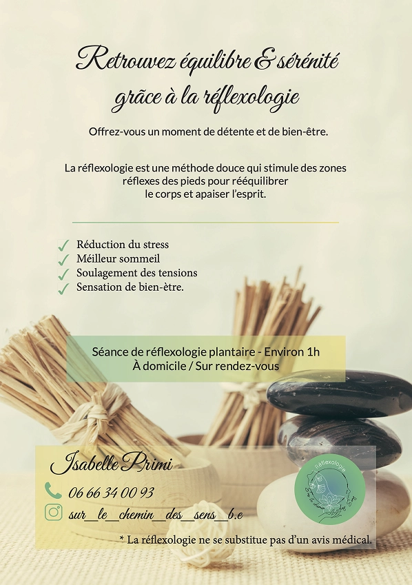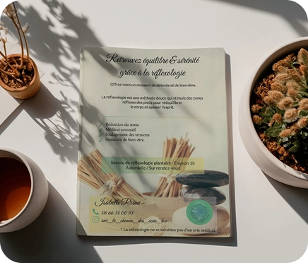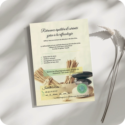 Ce flyer a été réalisé pour promouvoir des séances de réflexologie dans un univers visuel apaisant.