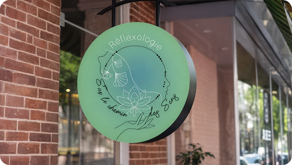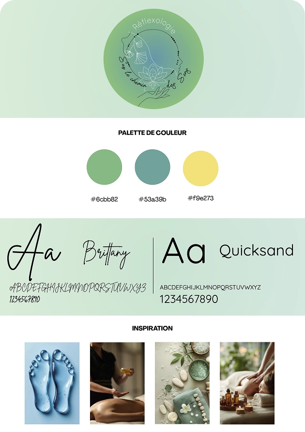 Les couleurs douces et naturelles ont été choisies pour évoquer la sérénité, l’équilibre et le bien-être, en cohérence avec l’univers de la réflexologie.